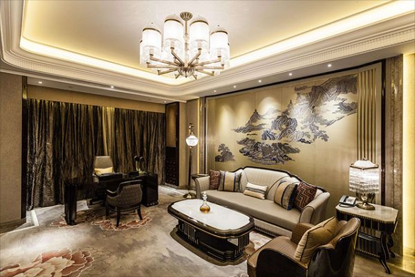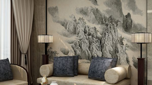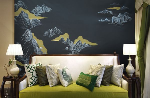 一浓一淡,一明一暗,绣线勾勒了山谷的峰会路站,描绘了河水的汤汤东流。水墨山水的壮丽,从一丝一线中铺陈而开:绣线在灯光的折射下绽放出圆润的光泽,山河爆发出熠熠生辉的光亮,墙面瞬间拥有了华彩。看似山河飘渺无边,却道世间华章。