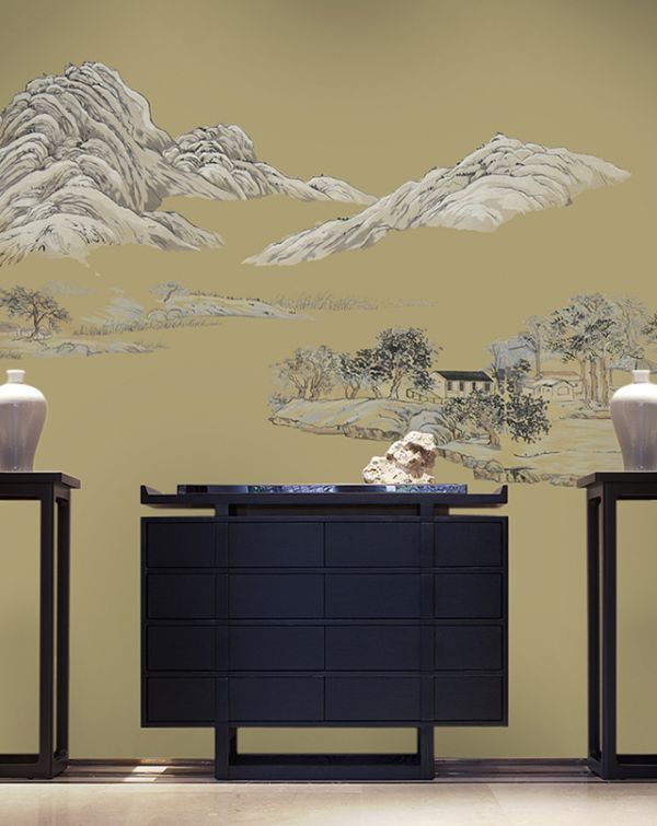 点的颜色过渡、面的和谐搭配,均通过同一绣线的深浅转承而来。水墨的着色在于浓淡相宜的层叠,山水画的禅意却在于留白的自然融合。树影重重、芳草萋萋,淡去了绣线的华丽光泽,将其巧妙地融合进了《山水人家》的诗意缱绻。山为德,水为性,咫尺天涯的层次布局,将意境为图的方式转化成了生活为用的生活美学。