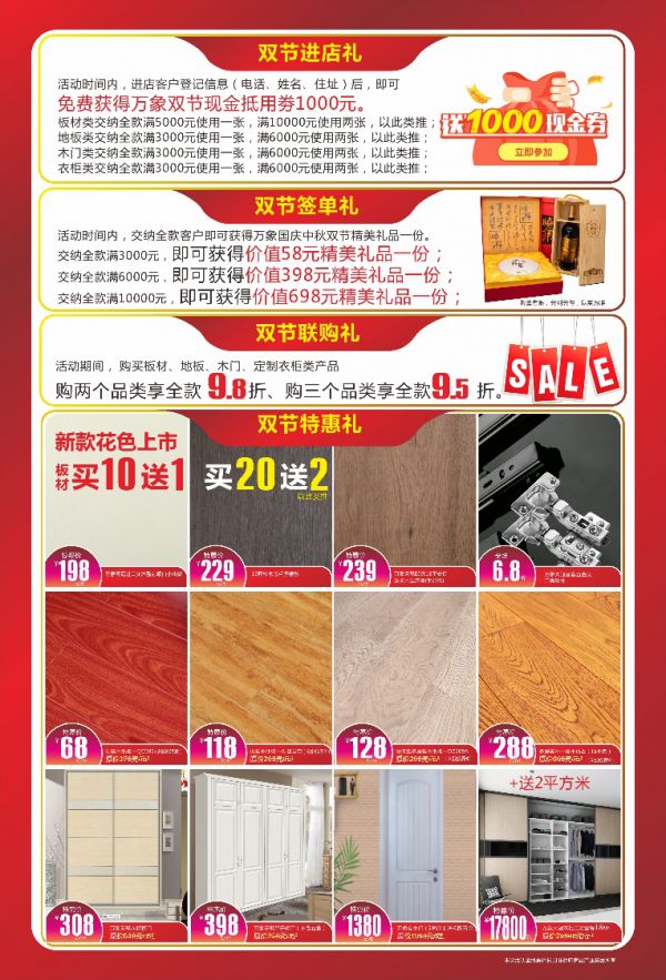 活动时间内,板材、地板、木门、定制中购两个品类享全款98折、购三个品类享全款95折。