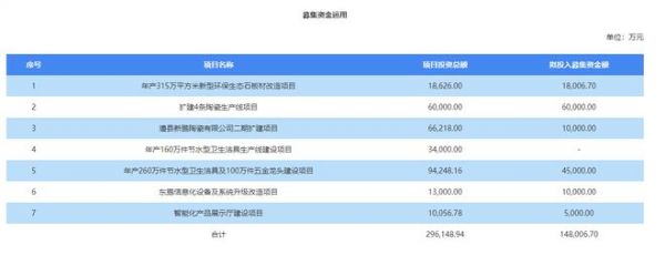 据东鹏控股28日公开的股票发行公告,本次预计募集资金总额为16.2305亿元,扣除发行费用后,预计募集资金净额为14.80067亿元,募集资金投资的项目包括有:年产315万平方米新型环保生态石板材改造项目、扩建4条陶瓷生产线项目、澧县新鹏陶瓷有限公司二期扩建项目、年产260万件节水型卫生洁具及100万件五金龙头建设项目、东鹏信息化设备及系统升级改造项目、智能化产品展示厅建设项目。
