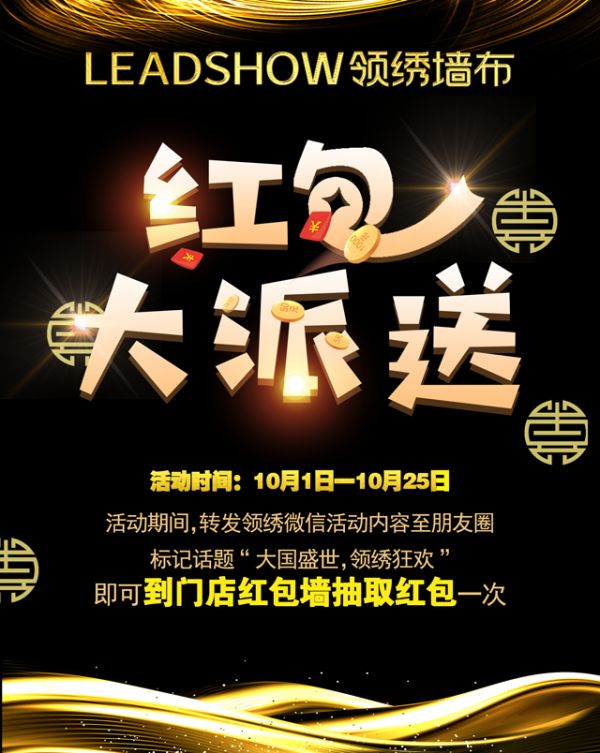 活动期间,转发领绣微信活动内容至朋友圈,,标记话题“大国盛世,领绣狂欢”即可到门店红包墙抽取红包一次。