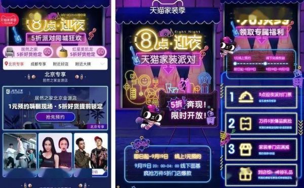 此外,在9月19日当天,天猫家装携手红星美凯龙和居然之家等头部家居卖场,共同开启首波“8点迎夜”活动。搜狐焦点家居获悉,本次活动是天猫家装行业的首个本地化营销IP,活动形式不仅限于优惠促销形式,同时融音乐、美食、娱乐于一体。