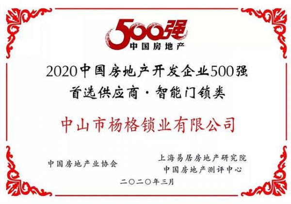 图为杨格锁业荣获“2020中国房地产开发企业500强首选供应商”