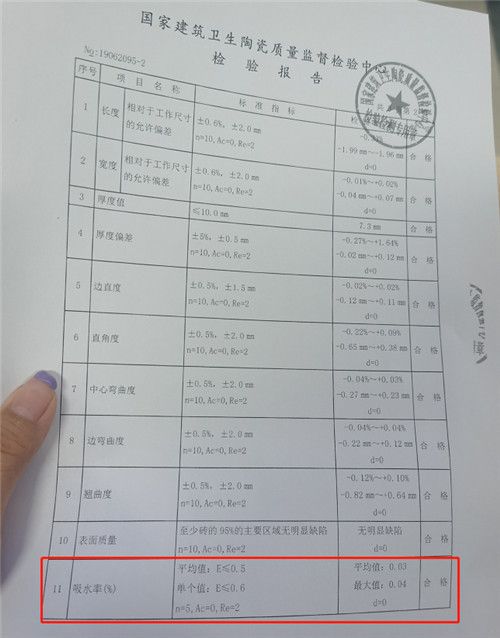 记者通过亚细亚销售员提供的ECO健康砖的检测报告,可以看出亚细亚ECO健康砖吸水率的平均值为0.03%,远远小于国家标准的吸水率0.5%。说明亚细亚瓷砖瓷砖致密度非常高,产品的硬度、强度等性能更好。