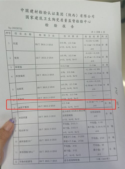 装修中一般验收瓷砖的铺贴效果时,最主要的就是看瓷砖铺贴外观及平整度和垂直度。从亚细亚世纪石检测报告可以看出,亚细亚世纪石的检测结果为-0.06mm~+0.11mm,远远低于国 家要求的技术标准±2.0mm,瓷砖的平整度达到“超平”。