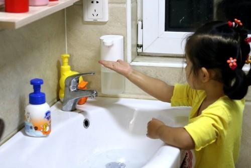 后来想着用泡泡洗手液或许能够吸引她一下,可又不得不面对两个问题,一是洗手液的按压对孩子来说比较吃力,完全按不动的节奏。还有一点主要原因是因为按压式洗手液存在二次接触污染的问题,本身按压的时候就会把一定量的细菌残留在上面,对孩子来说无形中又多了一层潜在危险。