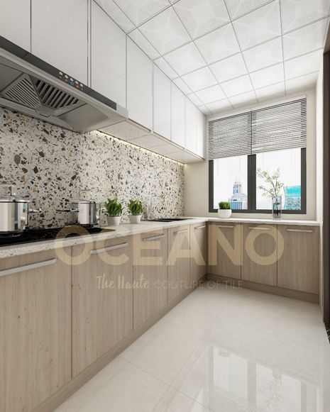 如翠石入釉,形状各异的零星点缀,不同饱和度的色彩游离于板面之中,以清冷为主基调的厨房,让那烟火少了股油腻的俗气,多了一份淡淡的清雅。粗细多变、色彩繁复的石粒汇聚于板面上,大自然那不可复制的花纹及色彩变化,让整个版面都显得独特迷人。