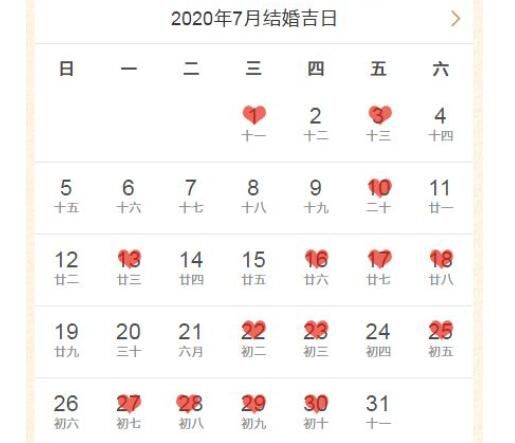 7、2020年7月份宜于领取结婚证的时间是7月7日,7月11日,7月30日。
