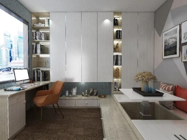 多造型的柜体组合兼具装饰功能,让墙面设计更加丰富;留白处摆放喜欢的摆件或装饰品,让榻榻米空间更有艺术气息。