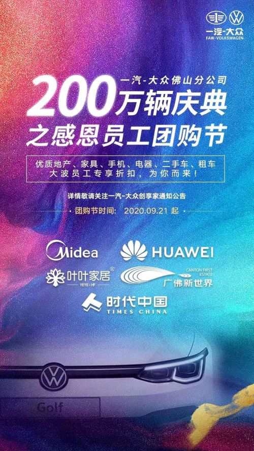 2020年9月21日,德国大众(中国佛山公司)为庆典200万辆车下线活动,特邀约广东省较为有影响的各大企业参与员工团购节活动,其中邀约的企业有:华为、美的、时代地产、广佛新世界以及家具行业代表企业叶叶家居等5家企业联合一汽大众佛山公司一起庆祝公司200万辆车下线员工团购过节活动。叶叶家居有幸受邀参与了本次活动,并取得了一定的效果,以下是部分活动一览: