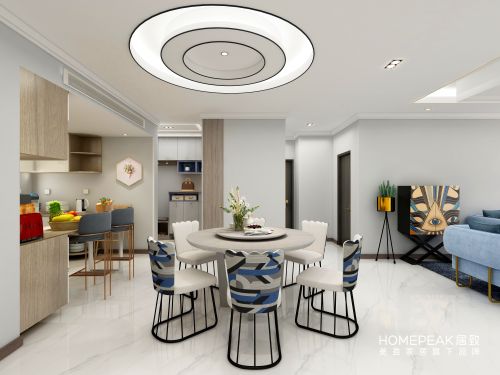 简约、自由、个性是整个餐厅的主旋律。大量的留白让空间回归它的本质,留有呼吸感的余地,空间更具温度。餐厅设计多了一份纯粹的意蕴。波纹型椅背搭配几何图纹,抽象而理性的造型展现现代美学的魅力。曲线感支脚折射出趣味与艺术的空间气质。圆形餐桌自带转盘,为就餐时刻提供了便利性,灰白色的色调,干净利落,视觉效果通透而明朗。