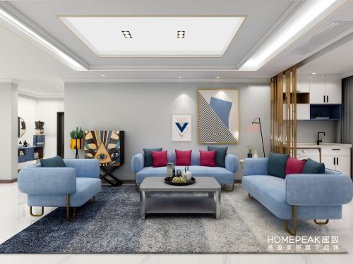 客厅的主色调采用勿忘草色,一种令人心情舒畅的色彩,让人联想到天空碧海,却没有深蓝的凝重,更多的是清新和舒适。勿忘草色的布艺沙发,内含高回弹海绵坐垫,功能和美观兼具,玫红色抱枕与沙发形成冷暖色互补,动静两相宜。现代抽象的装饰画,不经意间将主人的个性气质显露于外。铆钉与木制组合而成的茶几,糅合了现代感与自然感。高级灰的色调形成了颜色过渡,与渐变的地毯相呼应,柔和了视觉的冲击,彰显清新的现代简约风格。看似平常的家具,经由设计师的组合搭配,便拥有最隽永的温情日常。如深海般波光粼粼的蓝色单人沙发椅,带来静谧深邃的气质,搭配精致小巧的角几,营造一个悠闲美好的下午时光。