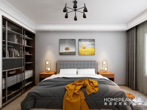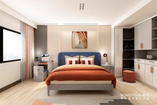 主卧室一般是主人屋主居住的地方,选择华美的宝蓝床屏邂逅明快的落日橙床品,轻奢个性、温暖雅致,整个居室呈现生动而鲜活的画面,身处其中,都能感受极具视觉冲击力带来的品质感。用角几代替床头柜,给人一种轻盈休闲的感觉,铆钉与金属材质的搭配,为空间增添精致轻奢的工业气息。看似小巧其实包含玄机的床头柜,满足了女主人的收纳需求,自带镜子的床头柜,增加生活的精致感。爱马仕橙单人布艺沙发椅,为居室点染出赏心悦目的活力之意。棉麻质地,亲肤且温馨,黄金依靠角度,完美释放主人的压力,宽厚的椅背,享受被环抱的安全感。