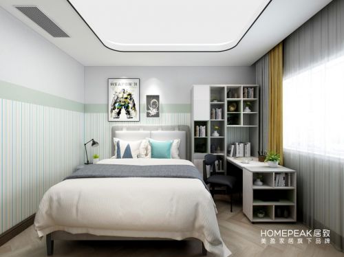 男孩的房间设计偏向现代轻工业风。多格储物柜与书桌的镶嵌搭配下,空间得到充分利用。高级灰与乳白色的床品床具,让空间更具调性,视觉开阔明朗。暖黄色窗帘增添室内柔和细腻的质感,刚柔并济,令空间层次更加丰富。