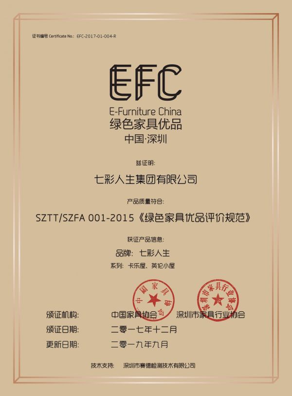 刚落幕的第35届深圳家具展,七彩人生被特别授予“五星企业+中国绿色家居优品”评定。