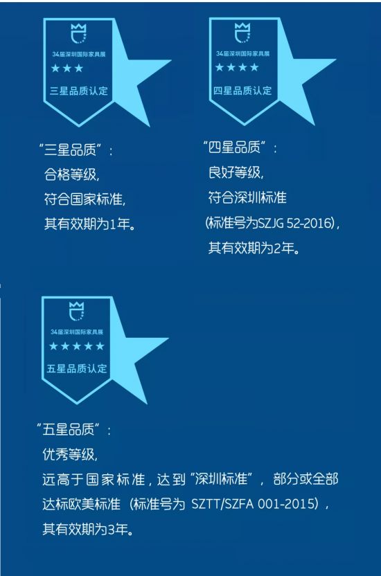品质星级评定是针对深圳家具展所有参展商的一项品质准入门槛,该认定由专业的第三方检测机构对企业的品质控制体系进行全面审核,以高于国家标准的欧盟标准对关键原材料及成品进行严格抽检,经层层筛选得出。