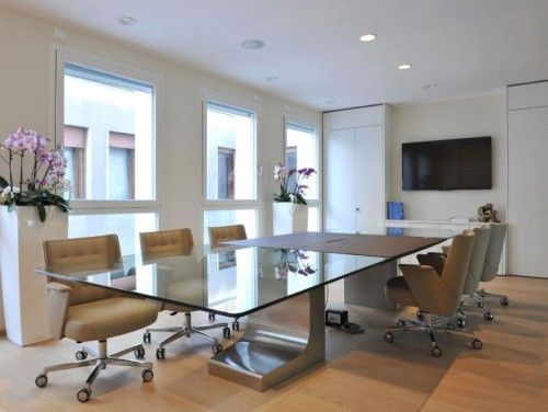 同系列亦有会议桌款式,桌面可用玻璃、皮革包覆做搭配。双C型脚保留1985年的经典设计元素,同时增加走线盒,满足现代办公的需求。
