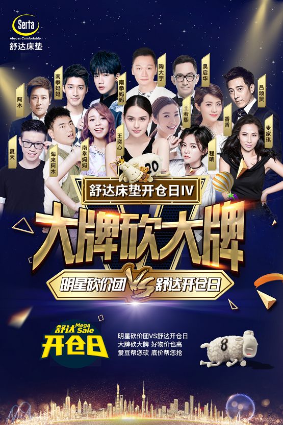 2020年10月1日-18日,阿木、吕颂贤(中国香港)、程响、南拳妈妈组合(中国台湾)、王若熙、陶大宇(中国香港)、吴启华(中国香港)、王奕心、香香、夏天、海来阿木等两岸三地明星,化身豪华阵容明星砍价天团,将来到全国13个城市舒达专卖店,爱豆帮您砍,底价帮您抢。这个超长假期,中秋、国庆、开仓舒达的三重超值优惠,由他们为您而定!即日起登录“Serta舒达床垫”微信小程序,领取明星开仓卡、集满明星卡、为“最美店铺”/“最美店员”/“最美服务星”投票,将有意外惊喜等着你!