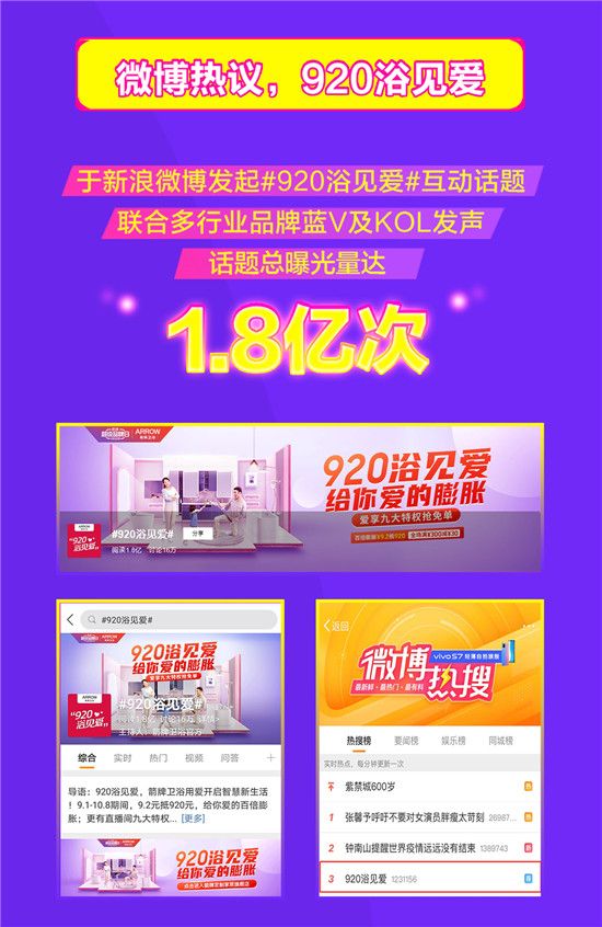 箭牌卫浴以“920浴见爱”为活动主题,通过“前期内容种草+中期话题互动+直播全线宣发”的组合形式,在超级品牌日全阶段持续发力,全方面吸引用户参与至超级品牌日的狂欢之中。