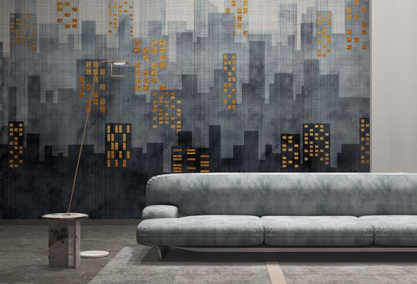 灵感取材于上海的繁华,《摩天大楼》壁画,以现代轻奢为设计理念,使用蓝灰为主色,通过不同饱和度的色调布局,呈现出层次分明的画风,描绘现代摩登时尚。寓意尊贵的金色作为点缀,冷与暖的碰撞,让清冽优雅的都市中充满温情。华灯初上,万千灯火点缀高楼林立,打造出一个时尚又不失温馨的空间。