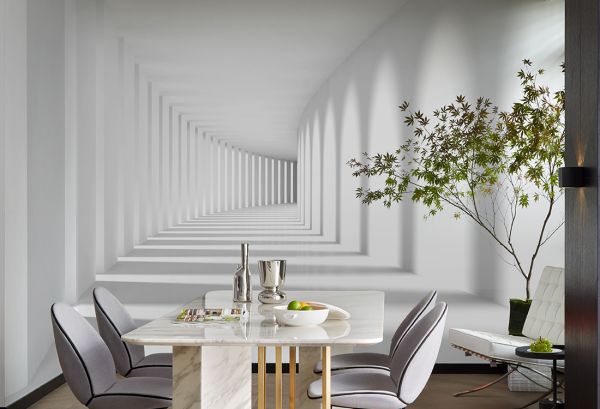 不同的视角注定看到的是不一样的风景。壁画《时空走廊》,以绘画中的透视理论为设计灵感,使用欧式经典的灰白为主色调,,组成后现代极简的几何走廊和圆拱造型,通过明暗和光影,构筑出一个错落逼真的三维时空隧道,让空间在视觉上无限延伸,打造出一个充满神秘的立体艺术空间。