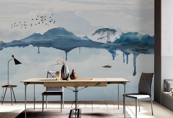 “落霞与孤鹜齐飞,秋水共长天一色“,取意著名诗人王勃的诗句,壁画《天空之镜》,以新中式为设计理念,运用蓝色为主色调,辅以高级灰,通过不同饱和度的色彩搭配,展现出一景一物的层次分明。远山近水,一叶扁舟,一群飞鸟,动静结合,将最美天青色的意境描绘的淋漓尽致。一幅东方雅韵的山水画,如同天空之镜超然清新。