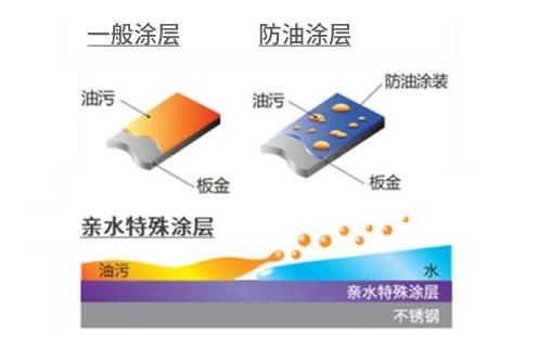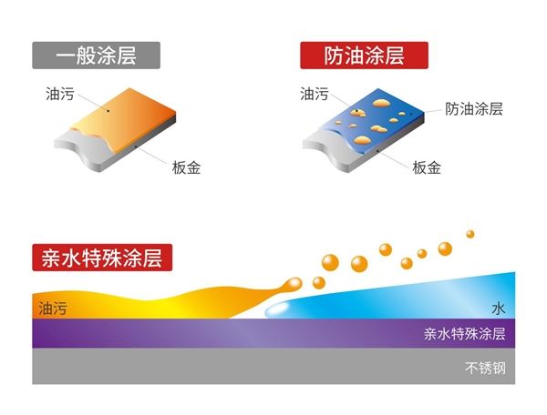 除此之外,富士帝CXW-230-CL2系列油烟机最为关键的油烟分离盘的表面还使用了一种“亲水特殊涂层”。有了这种涂层,使油污遇到水后,更加容易浮起,便于清洁。