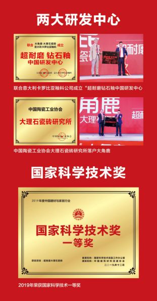 鉴于市场发展需求,大角鹿率先研发超耐磨瓷砖。据了解,大角鹿与世界第一釉料公司——意大利卡罗比亚釉料进行合作,成功独创了“超耐磨钻石釉”国家专利技术,使瓷砖耐磨度达4级以上,比普通瓷砖耐磨度高出3倍,彻底解决了传统瓷砖不耐磨、易磨花的最大缺陷,大角鹿也凭此赢得国家科技技术一等奖,并拥有中国陶瓷工业协会授予的“大理石瓷砖研究所”和联合意大利卡罗比亚釉料公司成立的“超耐磨钻石釉中国研发中心”两大研发中心。