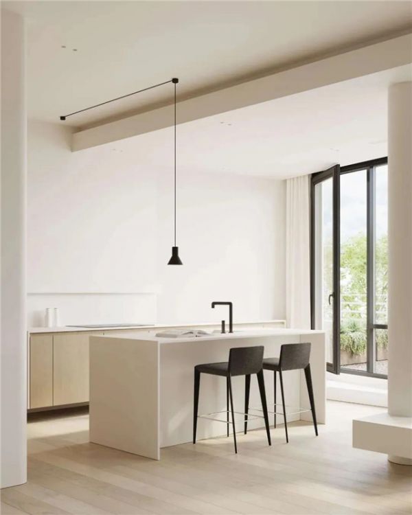 于简质空间中,保留墙面的纯白,点缀金属与黑色。光线与内饰的结合刚刚好,穿越绿植的斑驳光影反射生活的光明美好。