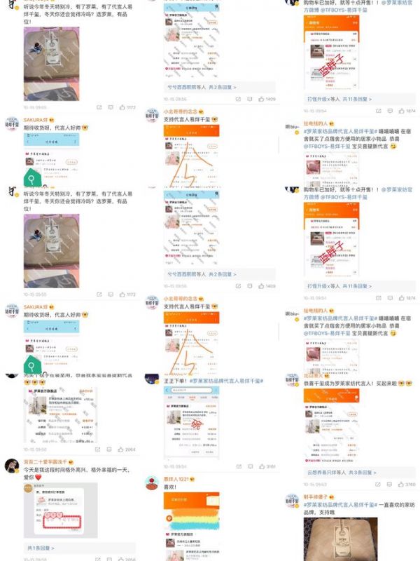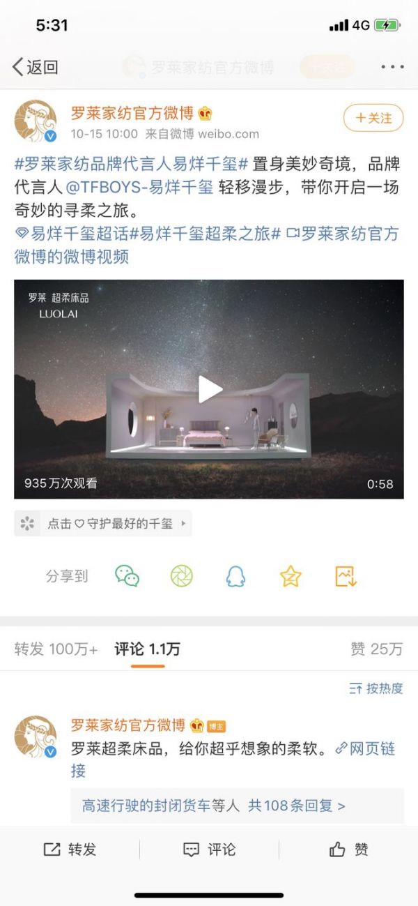 10月15日,罗莱家纺在新浪微博官宣易烊千玺成为新一任品牌代言人。24小时内,相关话题阅读量破2.5亿,讨论量破350万;《寻柔第六感》概念大片释出,微博播放量破900万!