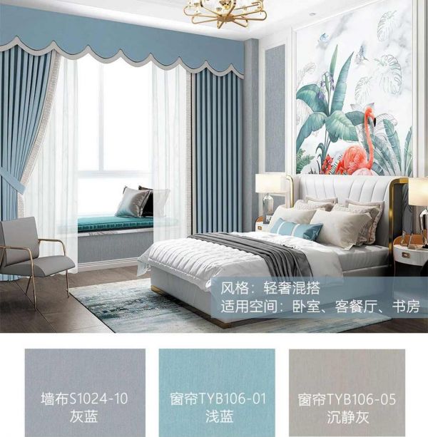 天洋墙布轻奢混搭系列,由专业软装搭配师精心挑选及搭配,将高品质墙布与柔美窗帘进行艺术化组合,丝绸般柔软的面料,经纬交错的丝线,织造出内敛、低调的轻奢感,运用独创的四层结构环保墙布,免胶环保,熨贴上墙,透气防霉,防水防污,为屋主提供省心、便捷的产品组合方案,打造一处轻奢、高级范的精致空间!