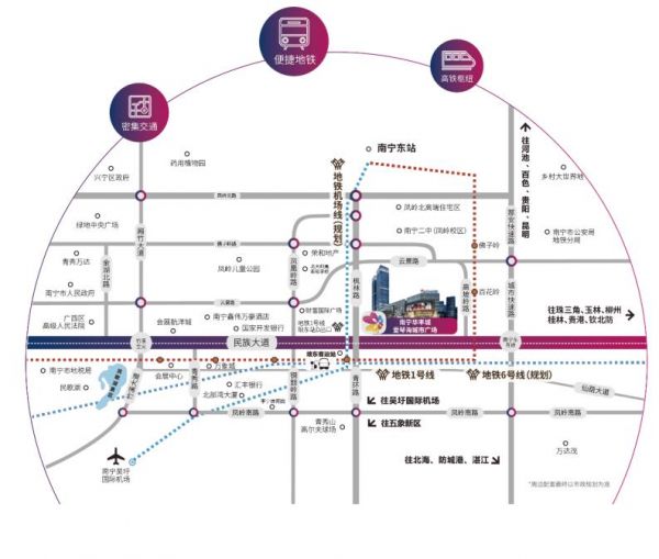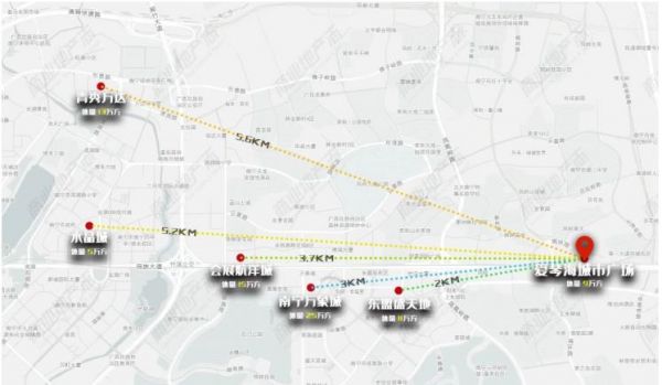 该项目与会展航洋城和南宁万象城之间,间隔了一段3KM左右的距离,从位置关系而言,形成了较为有错位感的商圈延续。