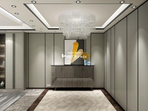 在入门的玄关处,使用了大面积的银梨灰护墙板,给入门时产生的第一视觉感受带来浓郁的轻奢感。配上了嵌金的西班牙云石板矮柜,有种干净利落,简洁明净的感觉,引导你走入超乎想象的室内,同时也增加了画面的层次感。就这样的设计仿佛在告诉你:就在此卸下烦恼吧,拍去尘土,欢迎回家。