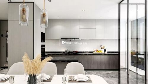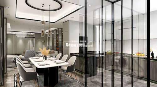 同样的玻璃隔断在餐厅也被使用,使得整体空间显得更加宽敞,既通透明亮、又澄净灵动,让食物都显得更加美味诱人。并且开放式厨房的设计,完美的融合了空间的点、线、面,以银梨灰为主色调,搭配了黑灰熔岩河流木纹、岩板,衬托出空间的理性时尚。使得空间整体十分的美观。