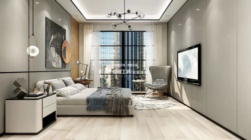 主卧则是延续了港式轻奢的空间基调,精心设计的背景墙选择了银梨灰、装饰铝条和实木格栅护墙板搭配,简洁又不失高级感。