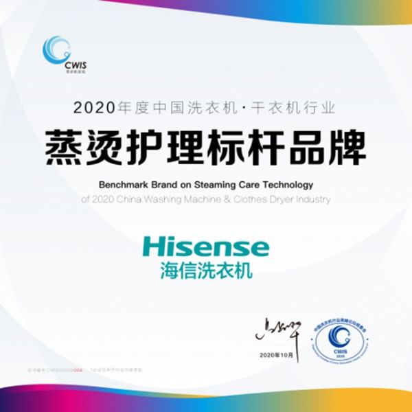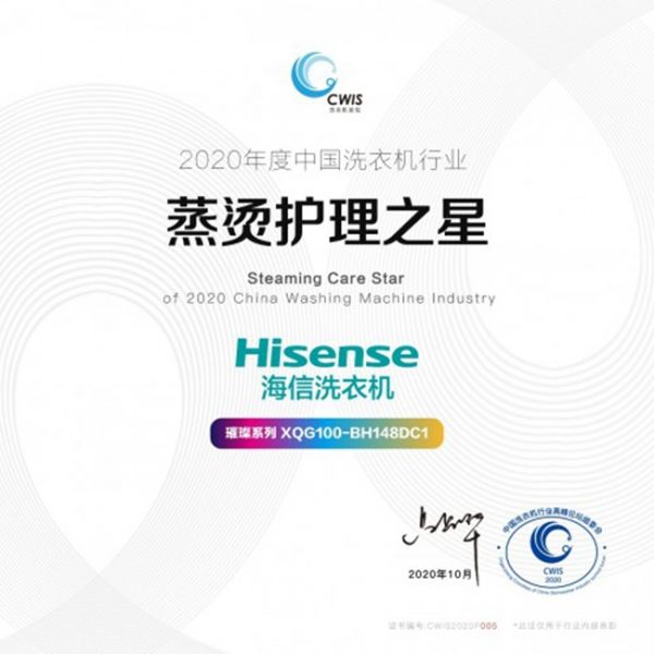 10月20日,由中国家用电器协会、国家信息中心信息化和产业发展部指导,中国家电网主办的“洗护有道 积健为雄 2020中国洗衣机·干衣机行业高峰论坛”在北京举行。海信洗衣机凭借卓越的洗护科技以及在蒸烫护理领域的发展,一举揽获 “2020年度中国洗衣机·干衣机行业蒸烫护理标杆品牌奖”,海信新上市的璀璨系列洗衣机也荣获了 “2020年度中国洗衣机行业蒸烫护理之星”的奖项。