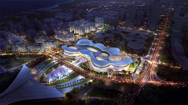 由中国旅游集团斥巨资倾力打造的全球最大海口市国际免税城项目,正是应运而出的一个全新的、具备引领海南国际旅游消费时尚的综合体项目。其承载了升级海南旅游商业发展模式,打造海南经济发展新动能,沟通岛内外、联通国际的重要使命。项目位于海口市西海岸,总占地面积675亩,总建筑面积92.6万平方米,拥有全球最大免税店,是岛外游客入岛的主要集散点,是沟通岛内外,联通世界的桥梁。 “九州祥云、南海之冠”作为设计理念,将艺术美感与功能特色完美融合,堪称经典设计。整个项目整体形象简洁宏大,建筑造型曲线灵动飘逸,宛若“海上祥云”,诠释了海口市国际免税城项目蕴藏着犹如祥云般浪漫飘逸的韵律、寄托了人们对祥云万里般福寿安康生活的憧憬。夜晚的屋顶灯光透过表层穿孔板的散射,喻义“彩云遮月”,宛若星空银河,画龙点睛地为整个项目增添了夺目的“璀璨”之感,大气磅礴,美轮美奂。体现出建筑与结构、力与美的完美结合,使海口市国际免税城项目真正成为海口市当之无愧的“城市新名片”。用地内各功能业态打造成如祥云般灵动飘逸的形态,结合乐活体验运动、游乐项目与热带雨林主题风情园式的主题商业经营模式,达到人与人、人与自然、人与建筑之间的和谐交融与感官享受,将游客带入了一个耳目一新的主题体验互动式国际商业嘉年华。诠释了海口市国际免税城项目是 “根植本土的魅力名城,面向国际的滨海港城,健康宜居的活力乐城,彰显生态的花园绿城”的特点。