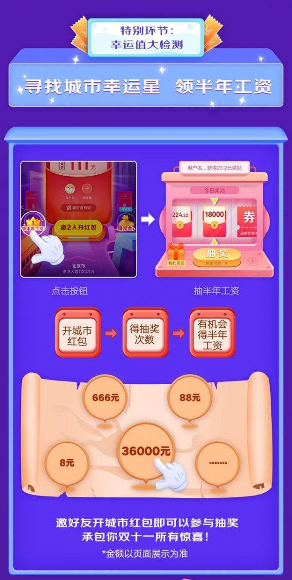 今年的京东双11城城分现金活动还有一个隐藏彩蛋,那就是参与活动的小伙伴在“邀好友领现金”玩法中每开1次城市红包,有机会获得一次抽奖次数。然后在活动主页中点击“领半年工资”图标,就有机会抽取无门槛购物红包、品牌优惠券等惊喜大奖,而这些大奖能够在双11购物之时尽情享用,满满的都是诱惑呀,小伙伴们轻松参与进来,就能让这个双11不止是花钱买买买,还有玩着把钱赚了的惬意。