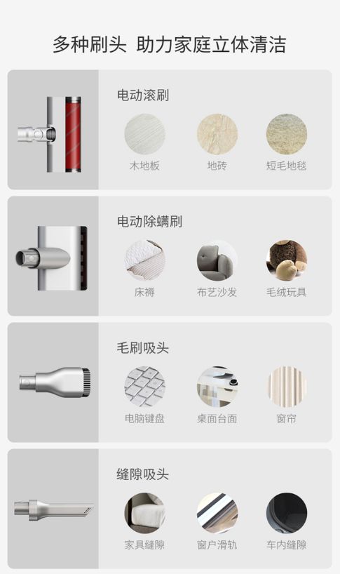另外,中国家庭的清洁需求和吸尘器的工作环境复杂多样,除了地毯、地板、地砖之外,床、沙发缝隙、桌子、椅子和橱柜等空间通常是难以清理的死角。然而,深谙中国家庭用户痛点的顺造依托技术优势,通过创新设计给出了解决方案。顺造吸尘器L1配备了电动滚刷、电动除螨刷、毛刷和缝隙刷头等多个刷头,不同的组合搭配,不仅可以帮助我们进行清扫地板还能够为木地板打蜡、清除地毯里的毛发、吸附被子上的螨虫、车内的灰尘细屑等,轻松满足我们更多的使用需求。