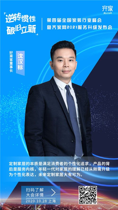 好莱客董事长沈汉标确认出席齐家网第四届全国家装行业峰会