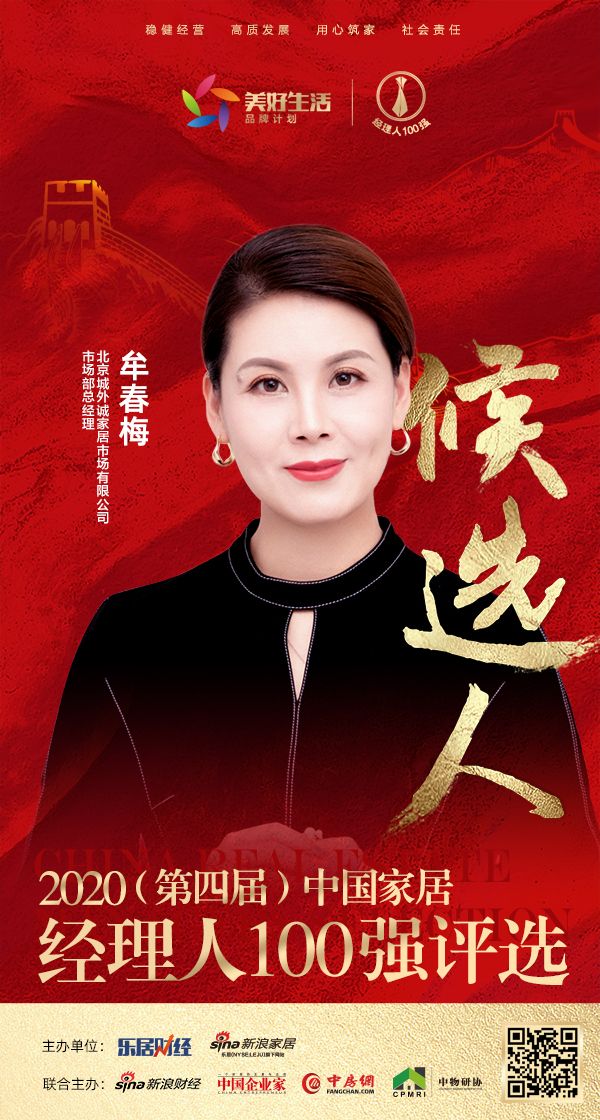新浪家居讯 由乐居财经、新浪家居主办,新浪财经、中国企业家、中房网、中物研协联合主办的“行稳致远——2020(第四届)中国家居经理人评选”网络报名正式启动。10月23日,北京城外诚家居市场有限公司市场部总经理牟春梅女士获提名,成为“2020中国家居经理人100强”候选人。