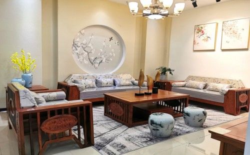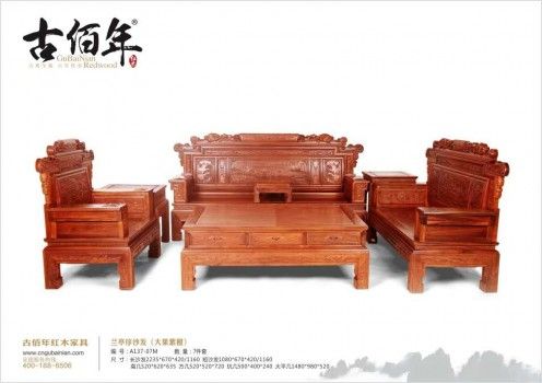 如果说文化底蕴,则不能不提馆内的其他商品了。本次中国红木馆七周年庆,古佰年推出了价值与审美兼具的兰亭序沙发七件套。此款沙发靠头采用官帽造型,寓意官运亨通、生意兴隆。靠背按照大书法家王羲之所书国宝《兰亭序》之意境雕刻山水、亭台楼阁,每一个靠背皆是一幅美丽的画卷,给人美的享受。雕刻了螭龙纹、金蟾纹、鸳鸯纹、回纹,寓意权势、金钱连绵不绝、周而复始,家庭和美。采用双层结构的靠背,里层弯曲有弧度,使人在坐靠之时能更好的拱托背部,更加的舒适,外层竖直,给人以厚实、稳重之感。扶手宽大,在衬托手臂之时更加舒适。全榫卯结构,全部精选缅花梨木,木纹瑰丽、颜色典雅。喜欢明式家具的朋友可以一览风采!