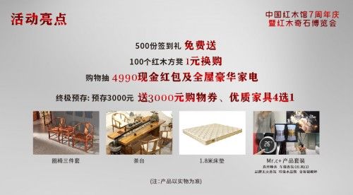 更多家具好物欢迎来中国馆红木馆鉴赏,这里栖息着宁静的中式生活。更多礼品尽在活动现场,欢迎来中国红木馆赏红木品奇石!