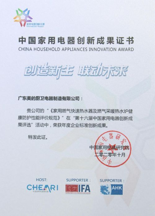 美的凭借《家用燃气快速热水器及燃气采暖热水炉健康防护性能评价规范》荣获“年度企业标准创新成果奖”。该标准以“家用燃气健康”作为主要诉求点,明确规范了健康型家用燃气快速热水器及燃气采暖热水炉的健康防护功能的技术要求和试验方法,能够更好地满足消费者提升生活品质的诉求,促进热水器行业的健康发展,推动热水器水质处理技术的研发。多年来,美的坚持关注热水器健康技术方向,以高度的社会责任感及追求极致的工匠精神,经过多年对健康热水器水质处理技术的研发,不断推出具有健康防护功能的热水器,掀起洗浴健康新潮流。