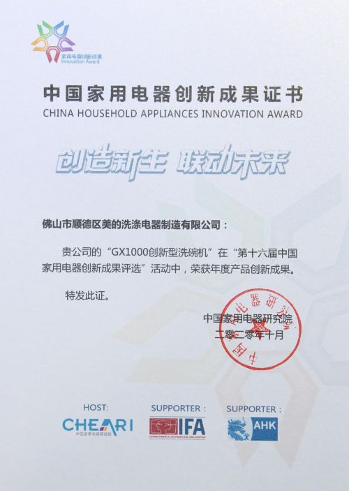 创新型洗碗机产品“美的中式灭菌洗碗机GX1000”,荣获了此次中国家电电器创新成果活动的“年度产品创新成果奖”。