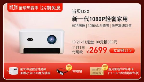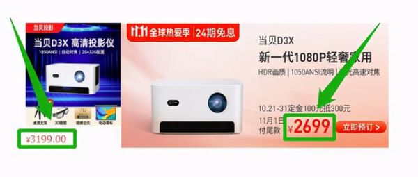 这款当贝D3X某东官方双11的活动海报,活动后是100定金+2699元尾款,外加约200+的赠品。但是在同平台的其他店铺中,同型号当贝D3X被卖出了3199元左右;价格差距一目了然,大家真的要细心点,这都是白花花的银子呀。