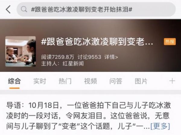 日前,微博一则热搜:#跟爸爸吃冰激凌聊到变老开始抹泪#。视频中父亲与儿子的对话,“你有点难过吗?为什么难过呀”“因为你老了”......简单的几句,却引发网友共鸣。