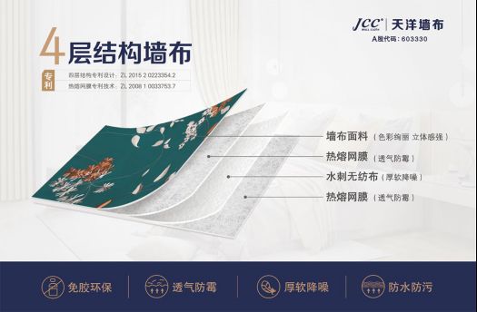 传统的内墙装饰材料往往需要用溶剂胶粘接,因此很难从根本上解决溶剂的挥发及带来的异味、甲醛等环保问题。天洋墙研发的4层墙布,以环保的热熔粘接材料替代传统的溶剂胶,免胶环保、透气防霉、厚软降噪、防水防污,有效解决了消费者对于环保安全性的担忧。