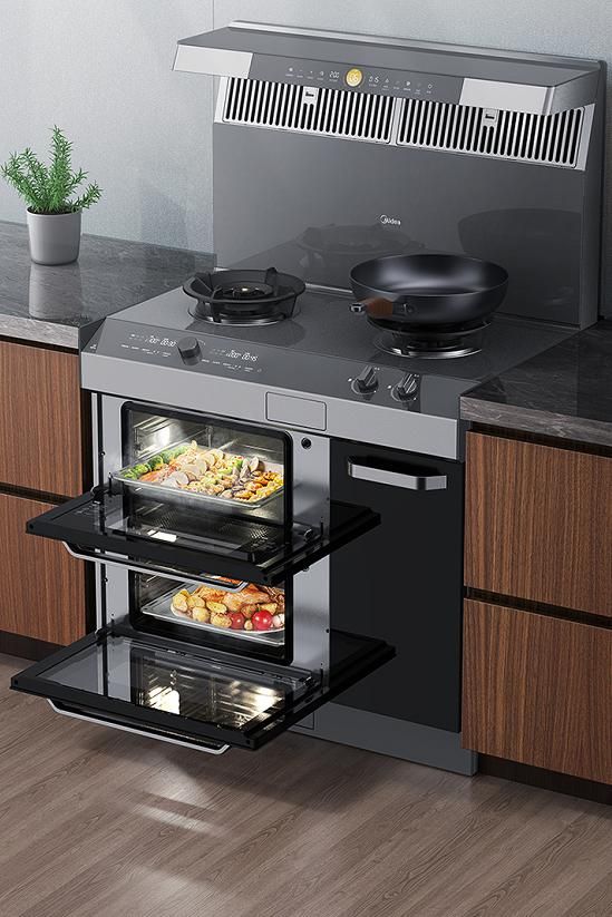 美的新一代独立蒸烤集成灶Y36 · 悦厨集烟机、灶具、蒸箱、烤箱、抑菌风干柜于一体,不仅可以极大的解放厨房空间,满足整体家装设计的美感需求,还可以给用户更方便的使用体验,独立蒸烤箱设计,可同时运作,为用户节省烹饪时间;45°E-Touch操控区设计,则充分贴合人体工学,让用户全程操作不弯腰;变频巡航技术可以一键静吸,打造无烟厨房的同时,减少噪音产生,给用户净与静的双重体验;而一键高温灭菌蒸汽洗功能,既能为用户解决清洁问题,又能高效灭菌;此外,用户还可以通过“IOT远程操控”技术,在美的美居app上对烟机实现远程操控,只需动动手指,便能获取智能菜单、进行智能预约、实现智能互联等,享受更便捷智慧的服务。