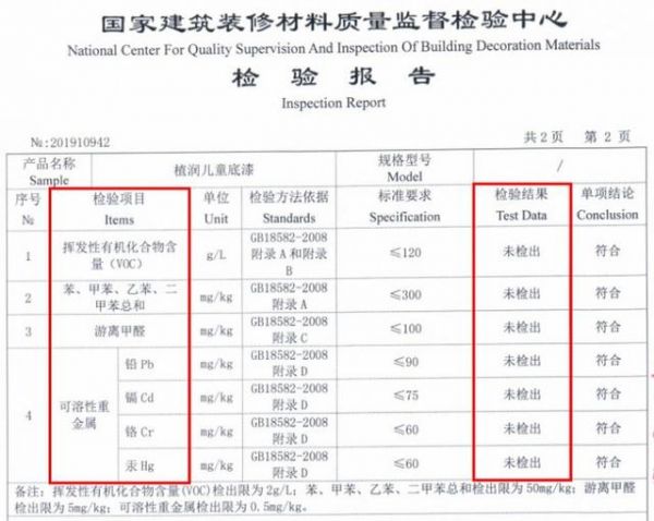 据了解晨阳水漆的儿童漆产品——植润儿童水漆在国家建筑装修材料质量监督检验中心提供的检测报告中各项有害物质(VOC、苯类物质、游离甲醛、重金属等)的检验结果为未检出,完全优于儿童漆标准。